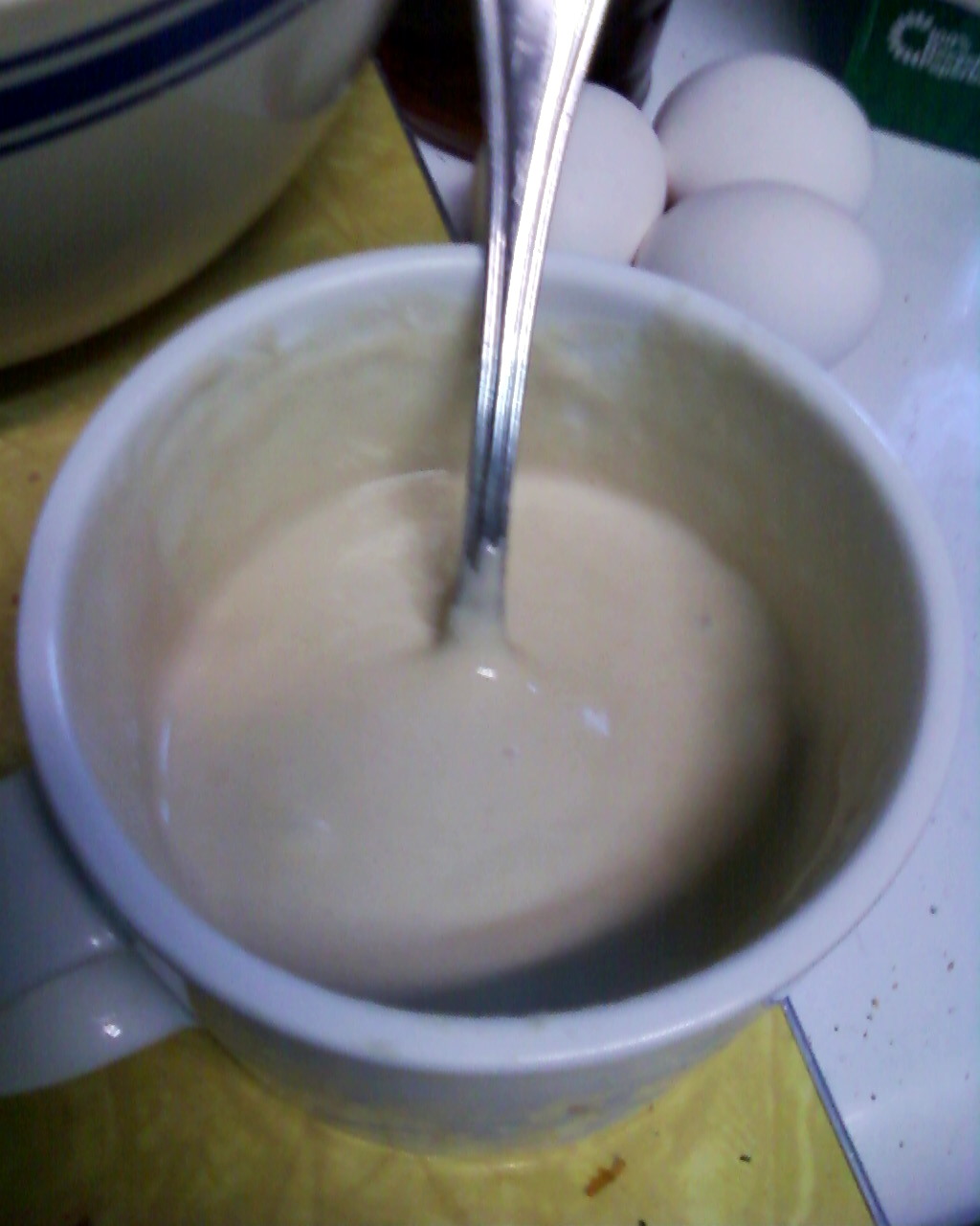 First, dissolve the yeast in the lukewarm milk and add a few tablespoons of flour to make a paste. It'll be thick, but not super thick.